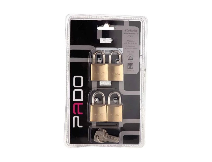 O Kit Cadeado Pado 25mm com 4 Chaves Iguais, modelo LT-25 ou E-25, representa a excelência em segurança coletiva e prática para múltiplas proteções no dia a dia, unindo quatro unidades robustas com o mesmo segredo para acesso unificado sem complicações. Fabricado em latão maciço anticorrosivo para o corpo de 25mm de largura, cada cadeado incorpora haste em aço cementado endurecido de 12mm de altura, resistindo a cortes, torções e intempéries em ambientes internos ou semi-expostos como portões, armários, janelas ou galpões leves. Seu mecanismo de trava com 4 pinos de precisão oferece 512 combinações seguras, atendendo à norma ABNT NBR 15271:2013 com grau de proteção médio, enquanto as quatro chaves em latão niquelado garantem duplicação imediata e manuseio suave. O design compacto e dourado elegante facilita o transporte em kits familiares ou profissionais, ocupando pouco espaço em bolsas ou gavetas, ideal para condomínios, oficinas ou residências que demandam controle sincronizado de acessos. Com garantia de 1 ano contra defeitos, essa embalagem em blister preserva a integridade para armazenamento prático, promovendo durabilidade sem travas acidentais. Representando a tradição da Pado desde 1936, esse conjunto transforma proteções rotineiras em soluções eficientes e confiáveis, elevando a tranquilidade com custo-benefício superior.